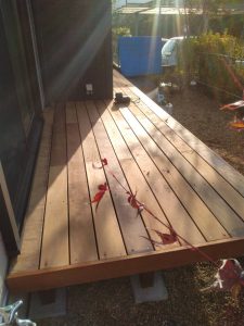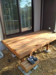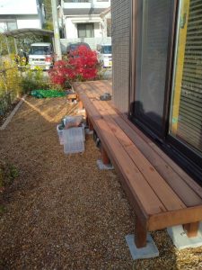 庭先でふと腰掛にもなる 濡れ縁 と ウッドデッキ のいいところどりの デッキです。