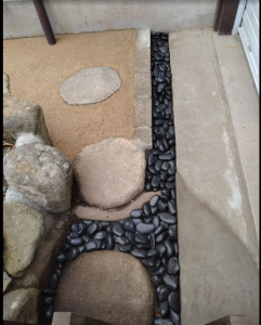 写真向かって右の倉庫既存土間の多さ、水下の雨水会所の高さを考慮すると十分な水勾配が取れません。 対策として、手前にレンガを敷いて、既存土間よりもたかくしています。 コンクリート土間と固まる土土間は高さが違うので間をお客様が好む那智黒石で埋めました。 ワンポイントでかっこいいですね。