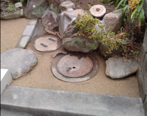 水下(流れてくる方向)の土を掘り起こしているとなんと、雨水桝が土に埋もれてかくれていました。