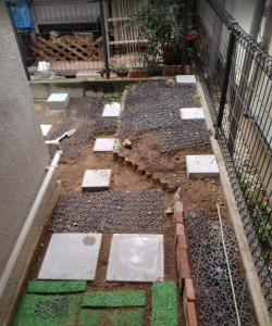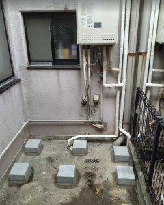 給湯器、排水パイプも考慮して束石も据え付けます。