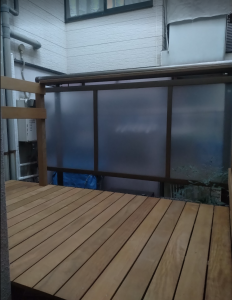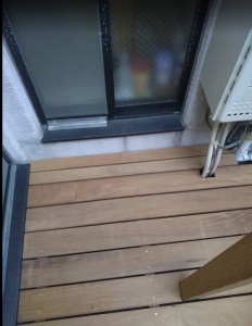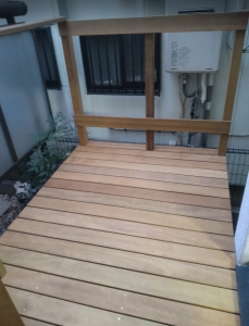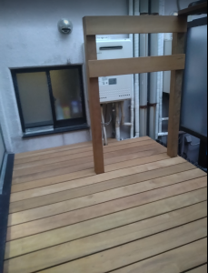 こちらのウッドデッキ 奥行き(赤線)が1.5m 高さが(青線)が90㎝ になります。