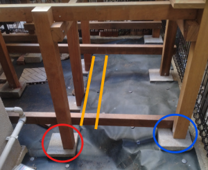 ウッドデッキの構造を組みます。 赤丸、青丸共にコンクリート束石の真ん中(芯)を外しています。 これは黄色線部分にブロックがあるので束石はこの位置になりますが出来るだけ青丸と赤丸の郷里を広くしない方が強度が保たれますので、敢えて寄せています。