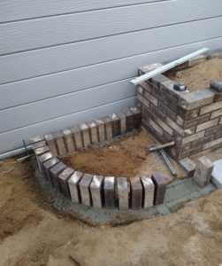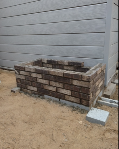 横にレンガ花壇の小端立てで花壇を作ります。 駐車場側から見える花壇です。