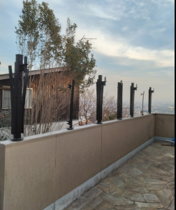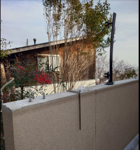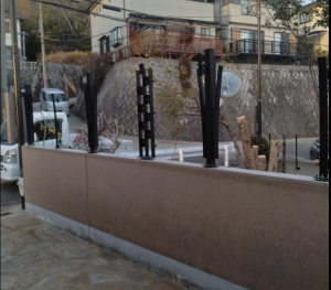 アルミ製の笠木を取り外します。 コンクリート擁壁の上にアイアンの柱を建てる為にケミカルアンカーで柱をこていします。
