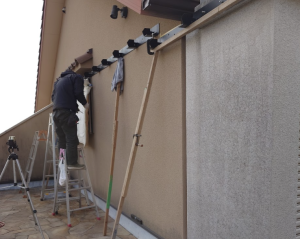 壁側は垂木受けを製作し、窓と庇の間に取り付けます。 アイアン(鉄)は重たいので、木材で借り受けして取り付けていきます。