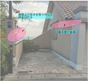完成イメージです。 建物際、垂木(ポリカーボネートの屋根)を受けるフレーム と 擁壁の上に立つ柱を オリジナルアイアンで造ります。 ポリカーボネートの屋根材を受ける垂木は防腐注入材の杉ざいになります。