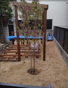 ヤマボウシの足元は水やりの為すこしあけておきます。