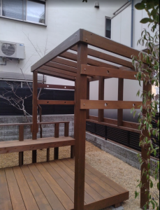 洗濯干しの為の屋根とサイドパネルの養生シートを外しました。 ポリカーボネートの板がマット調なので奥に見えるお隣さんの窓からの視線も気になりません。