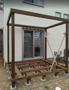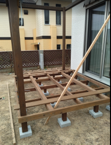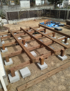 ウッドデッキの構造部分(根太、大引き)を組んでいきます。
