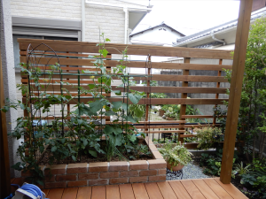 リビング窓から近くに家庭菜園。 目隠しフェンスは隣家に配慮して圧迫感のないデザインにし 窓部分だけは多く目隠しをしています。
