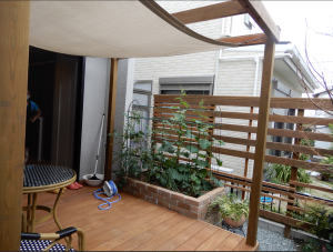 家庭菜園の横にはデッキ上に立水柱と排水パンを設置 水やりの手軽さと採取した野菜をここで洗えるようにしています。