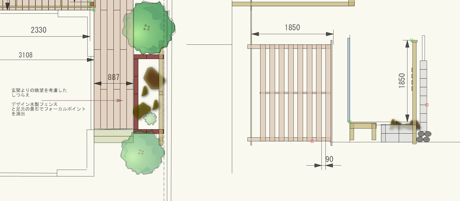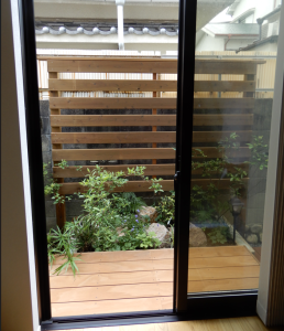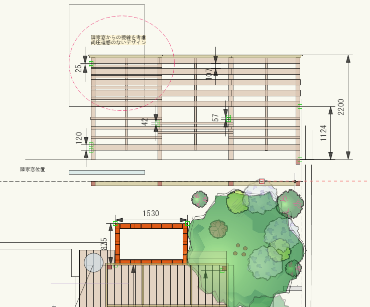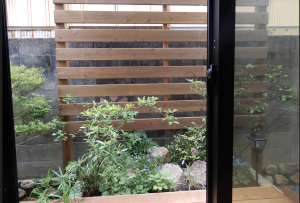 隣家窓部分はより隠すように。 木材とはいえ、出来るだけ、お隣さんがフェンスで圧迫感を感じない様にとお客様からのご要望です。