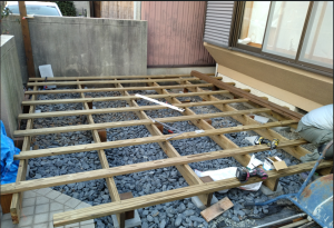 ウッドデッキの構造材は防腐、防蟻注入材です。 デッキ下の割栗(わりぐりいし)はご自身のお仕事で使われている石をつかってほしい。 とのことでした。