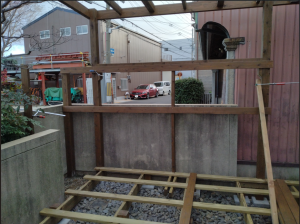 ポリカーボネート屋根をはるための構造部分をくみます。この時点ではしらの対角を確認します。