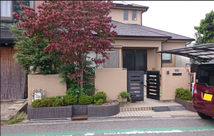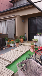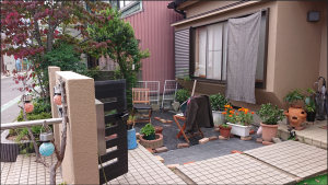 庭には防草シートをホームセンタでかわれてご自分でしかれていました。 少し味気ないので、雨の日でも楽しめるウッドデッキが欲しいというご要望でした。